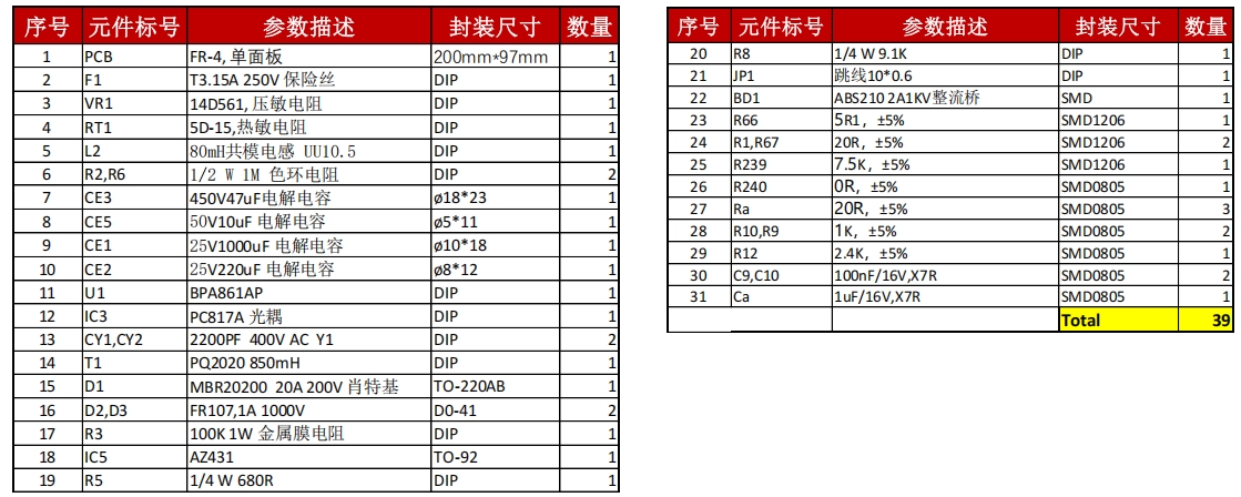 以上BOM清單涵蓋了電源方案中所有關鍵元件的詳細信息,包括元件型號、參數描述、封裝尺寸以及所需數量。這些元件的選擇充分考慮了性能、可靠性和成本的平衡,能夠滿足電源設計的各項要求。