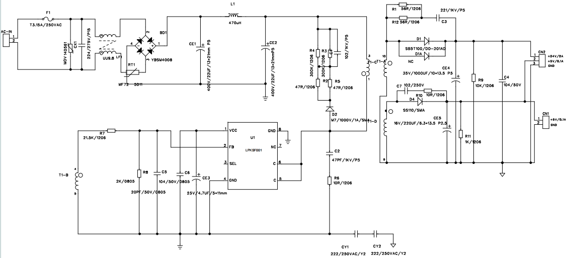 LPKSF001的原理圖是理解其工作原理的關鍵。它采用反激式拓撲結構,通過外置電阻和變壓器匝比來精確控制輸出電流和電壓。原理圖中還包括了輸入濾波電路、整流電路、反饋電路以及保護電路等關鍵部分。通過內置的啟動電路和自供電技術,LPKSF001無需外部啟動電阻和輔助繞組VCC供電二極管,從而進一步簡化了外圍設計。