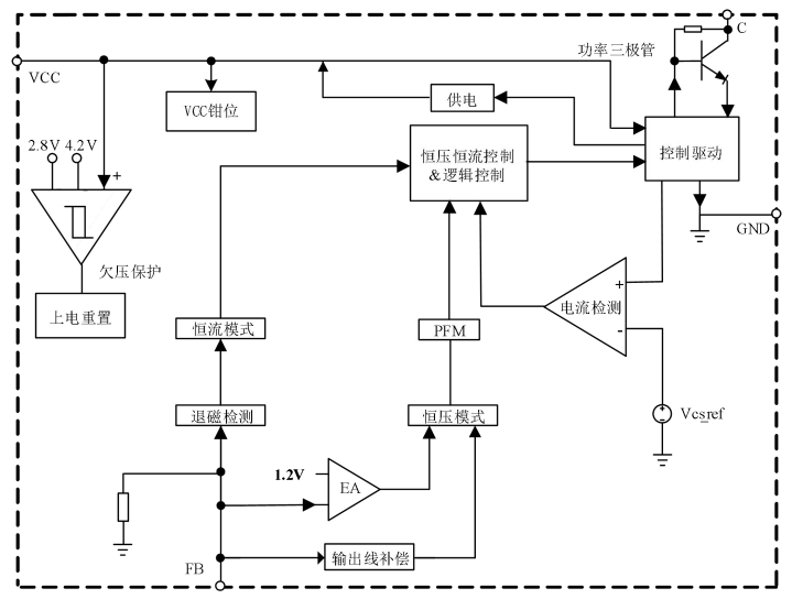3667系列芯片的內部框架圖揭示了其高度集成的設計理念。如圖3所示,芯片內部集成了功率三極管、VCC供電電路、恒壓恒流控制邏輯、欠壓保護、電流檢測、上電重置、退磁檢測等功能模塊。這種高度集成的設計不僅減少了外圍元件的數量,還提高了系統的可靠性和穩定性。