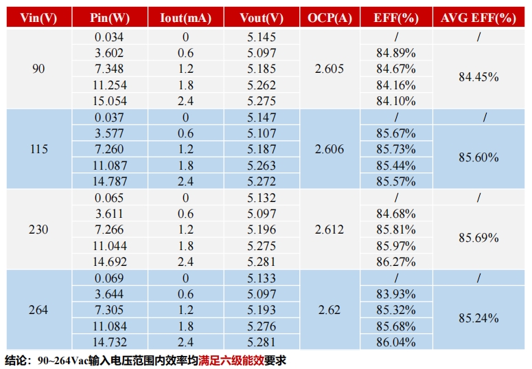 在90Vac至264Vac的輸入電壓范圍內,S7134B芯片的效率均滿足六級能效要求。具體數(shù)據(jù)如下表所示:
