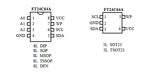 FT24C64A-ESR 提供多種封裝選項,包括 8 引腳 DIP、SOP、MSOP、TSSOP、DFN 和 5 引腳 SOT23、TSOT23。引腳功能如下: