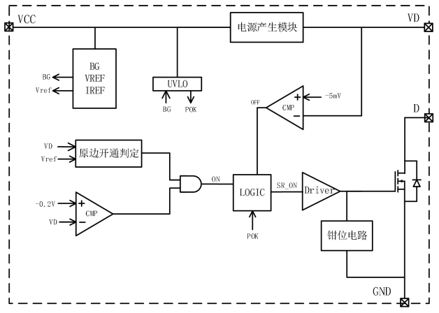 專利的整流管開通判定技術:通過檢測漏極D與GND之間的電壓下降閾值和下降速率,準確判斷同步整流管的開啟,有效避免因激磁振蕩引起的誤開通。