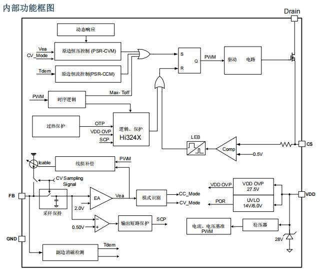 恒流:檢測(cè)CS腳+消磁時(shí)間Tdem,原邊算法把Tdem/Tsw鎖定在4/7,省掉光耦、431、次級(jí)電流檢測(cè)電阻。