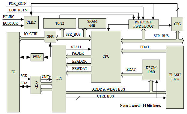 | Flash | 1K ×14 | 0x000-0x3FF,最后 16 字為中斷向量 |