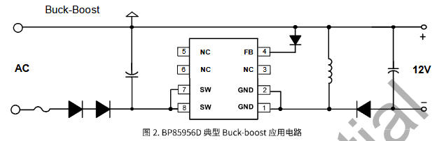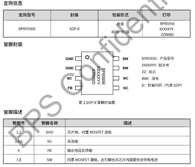 SOP-8封裝,絲印“BP85956D”下面還有一行小字“YYWWX”,內(nèi)部批次碼。管腳定義如下(頂視圖逆時針):